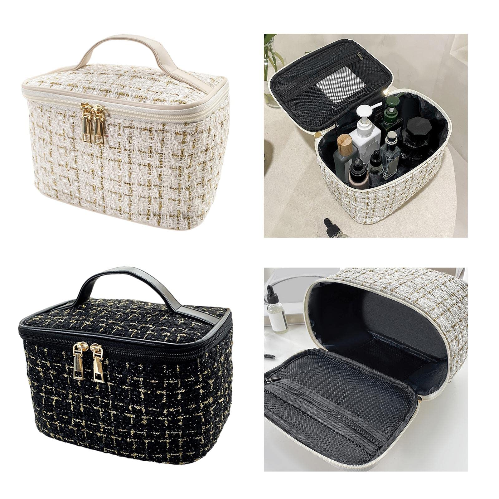 - Premium Aesthetic: Crafted with a textured, woven material, these bags emulate the luxurious appeal of tweed, enhanced by refined gold-toned hardware, including the dual-zippers and a charming, decorative clasp on the front. This design elevates the everyday makeup bag into a stylish accessory suitable for various settings.